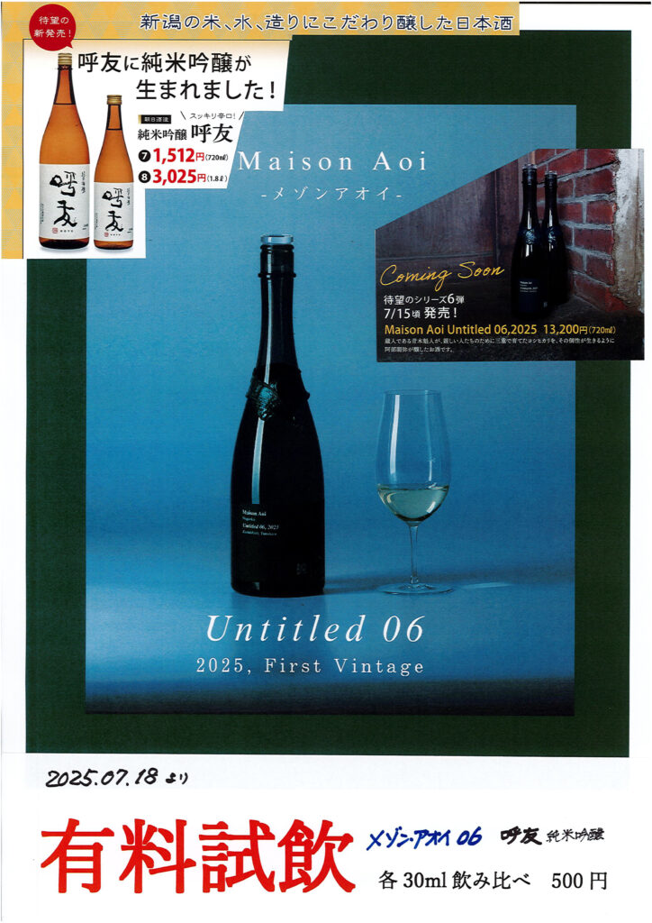 新しい味わいを体験できるチャンスです。7/15(火)新発売の「葵酒造 アンタイトル06」と、朝日酒造 待望の新作「呼吸 純米吟醸」を味わってみませんか?