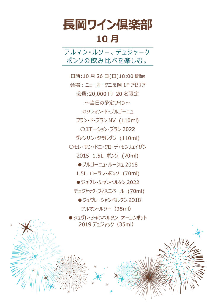 10月の長岡ワイン倶楽部のご案内です。今回はブルゴーニュの「アルマン・ルソー、デュジャーク、ポンソ」を取り揃えての飲み比べ。