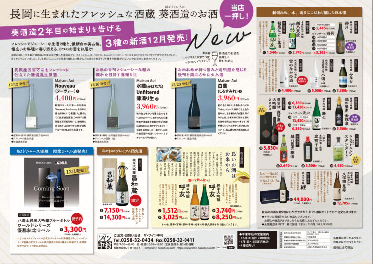 そして、日本酒からは好評の葵酒造の3種の新酒のご紹介と、話題の八海山ドジャース優勝限定ラベルのお酒(12月1日発売 絶対欲しい!という方は数量限定品なので、必ずご予約を)のご案内です。