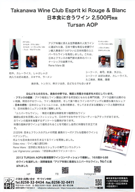 フランス南西部の「トゥルサン」このワイン産地は、世界的に有名な三ツ星レストランのシェフ アラン・デュカスやミシェル・ゲラールなどを生んだ地で美食の郷と言われています。このトゥルサンで、日本とフランスの美食家達が日本料理に合う普遍的なワインを長年かけて共同で探し求め作り上げた赤、白ワインです。赤、白は焼き鳥、トンカツ、串カツに。赤は和牛やカレー、ラーメン!?など、白は刺身、天ぷら、蕎麦などに。日本料理を引き立てる両ワインをぜひお試しください。